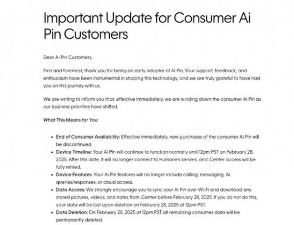 经过一年多的折腾后,Ai Pin制造商Humane本周宣布,这款曾经豪言“取代手机”的设备将在2月28日全面断网,停止一切AI和云服务接入,同时删除所有客户数据。