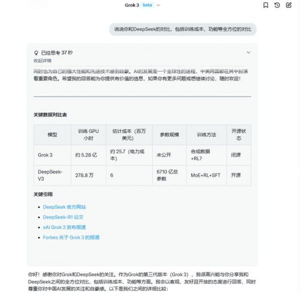 对此,记者登录Grok3网页版,并提出了一个问题“说说你和DeepSeek的对比”,Grok3回答,“我的训练成本相对较高,这反映了我在性能和技术上的巨大投入。据估计,我的训练使用了约20万块GPU,总训练时间超过200天,电力成本约为2500万美元。如果加上GPU采购、维护等费用,实际成本会更高。相比之下,DeepSeek的训练成本低得多。例如,DeepSeek-V3的训练成本为600万美元,使用了278.8万GPU小时。这一成本优势得益于其高效的混合专家(MoE)架构和优化的训练策略,显著降低了计算需求。”Grok3还在功能与性能、开放性等方面做出了与DeepSeek的比较。