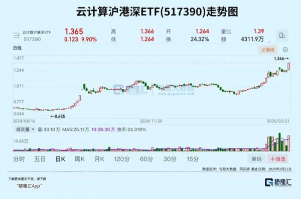 跟踪上海、深圳和香港三地云计算概念股的云计算沪港深指数大涨7.18%,在主要指数中涨幅位居全市场第二,跟踪这个指数的云计算沪港深ETF(517390)也大涨出现溢价,表现亮眼。
