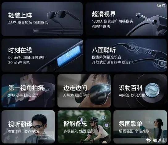 它还提供了“第一视角拍摄、实时导航、物品识别、实时翻译、智能备忘录”等多种功能。