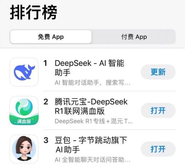 今日,腾讯旗下首个AI原生APP元宝超越豆包,升至中国区苹果免费APP下载排行榜第二。Deepseek继续位居榜首。