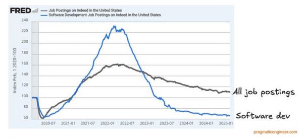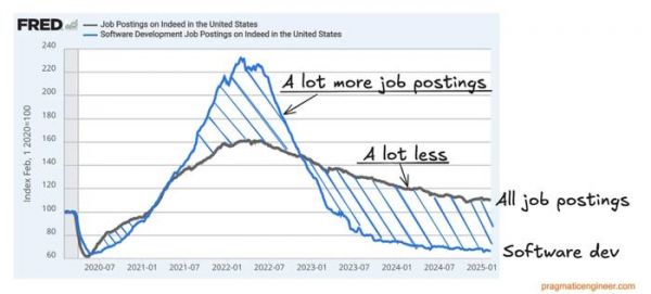 2020 年至 2025 年间,全部发布职位与软件开发发布职位的比较。生成式 AI 冲击——有没有影响?大家都知道,编码是大语言模型真正发挥作用的重要领域之一。而且这也并不让人意外,毕竟编程学科似乎就是为大模型的天然属性所量身定制的应用场景。