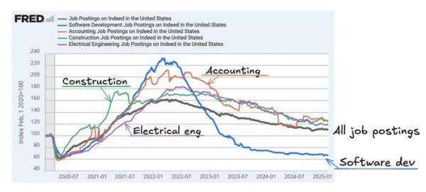 所有发布职位与软件开发职位间的对比。在 Indeed 上,2025 年 2 月的招聘信息比 2020 年 2 月增加了 10%,但软件开发者的招聘数量则减少了 35%。下面我们来深入观察其他哪些行业同样遭遇下降: