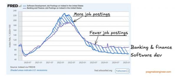2020 年至 2025 年,银行业及金融业与软件开发领域的招聘趋势比较。