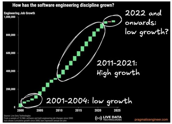 在 2021 年至 2022 年的过度招聘之后,企业内的工程师数量是不是太多了?这段时期确实是有史以来热度最高的就业阶段,企业纷纷以创纪录的速度争夺人才。但 2023 年开始,大规模裁员就已经启动。如今的招聘放缓,很可能表明企业在 2022 年仍存在大量“过剩员工”;或者说企业觉得之前的招聘节奏太快了,现在应当有所收敛。