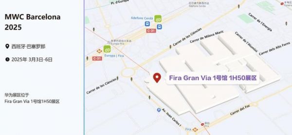 华为展区位于Fira Gran Via 1号馆1H50展区,展会期间,华为将展示5G-A与AI的融合应用,以及家庭智能化、行业智能化的创新解决方案。