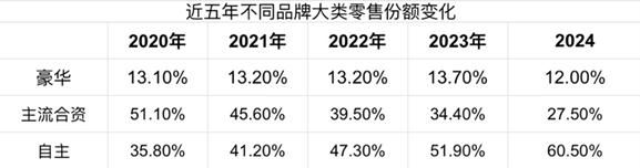 2024年,在价格战和新能源汽车快速增长的双向攻势下,主流合资品牌总体份额已经跌至27.5%,创历史新低。除了大众和丰田品牌尚位列车企销量TOP10,其他国人熟知的合资品牌已经被自主品牌甩在身后。
