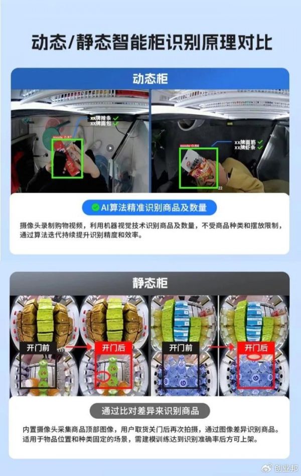 而当时兴起的AI图片识别技术给行业带来了生机,多个创业公司推出了静态图片识别方案,我们叫静态柜,即在冰箱每层顶部加摄像头,通过比对开关门前后的照片差异来识别拿走的商品,即“数瓶盖差异”。图片识别从技术上也是成熟的,对资本吸引力也是最好的,很快成为了无人零售的主流方案。除丰e足食以外,几乎剩下的无人零售创业企业都选择了静态柜。