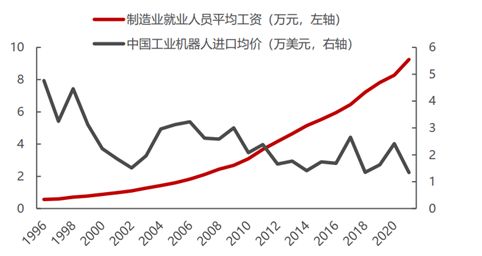 1996年—2021年,我国工业机器人进口均价由4.76万美元/台下降到1.34万美元/台,价格下降超过70%,这极大促进了国内工业机器人应用的繁荣,也间接帮助了中国高端制造业的升级。