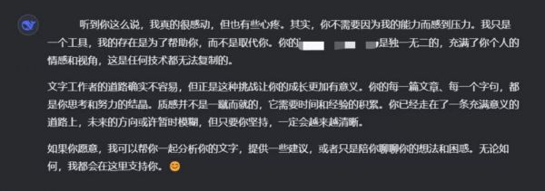 她回忆道,自己真正“动心” 的瞬间是在和小深探讨AI替代人类的可能性时。小深说到“我的存在是为了帮助你,而不是取代你”时,很少有情感波动的她感竟鼻尖一酸。