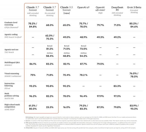 所以在公布的评测指标上,Claude 3.7 Sonnet其实在推理表现的某些指标上,依然不及o3和Grok的模型。