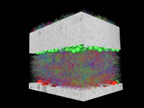 通过这种方法,我们能够观察这些仅30纳米厚的切片中的所有细节。如果把大脑切片比作一碗切开的意大利面,那么细胞体就是其中的肉丸,而神经纤维犹如意大利面。由于每个切片只有30纳米厚,我们只能看到许多被切开的面条片段,无法直接追踪它们的路径。相邻的切片中,“肉丸”(细胞体)可能稍微变大了一点,而“面条”(神经纤维)可能会出现在同一位置(如它垂直穿过切片),或者稍微偏移一些位置(如果它是斜向延伸的)。