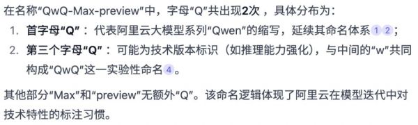 开启深度思考+联网搜索,问他「QwQ-Max-preview 中有几个 Q」?它不仅准确数出了两个 Q,还能结合联网信息拆解我的提问,额外回答了两个 Q 的含义。有被惊喜到~