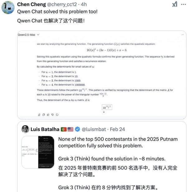 在代码和数学能力上,X 平台有更专业对口的网友评测。这分别是一位魔搭社区维护者和 TikTok 研究员的体验,在专业的数学竞赛题目和代码题目上,QwQ-Max 预览版的完成度均比较高。