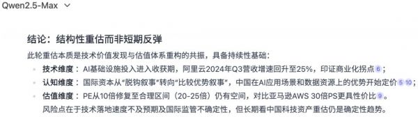 当问到「如何评价近日中国科技公司包括阿里巴巴,正在被全面重估的观点?这背后有多少可以支撑的论据?」时,thinking+联网搜索下的 Qwen 可以帮助人类节省阅读文献的时间,总结是相对清晰完整的。
