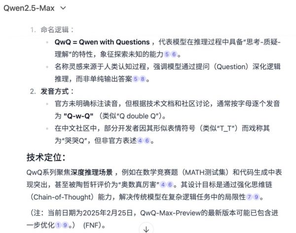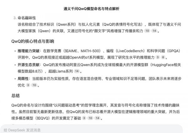 DeepSeek 可以精准检索到网页,给出「QwQ 的全称为 Qwen with Questions,体现了模型的设计理念:通过『提问、质疑与反思』的机制,模拟人类思考过程,深化对复杂问题的理解。QwQ 的官方发音为**/kwjuː/**,类似于英文单词「quill」(羽毛笔)的读音」,还可以提出自己的思考与结论「QwQ 的命名与设计均围绕「以问题驱动思考」的哲学理念展开,其发音与符号化名称增强了技术传播的趣味性。该名称结合了技术标识(Qwen 系列)与拟人化元素(QwQ 的表情符号化写法),既体现了与通义千问大模型家族(Qwen)的关联,又通过符号化的「颜文字」风格增强了传播亲和力。」