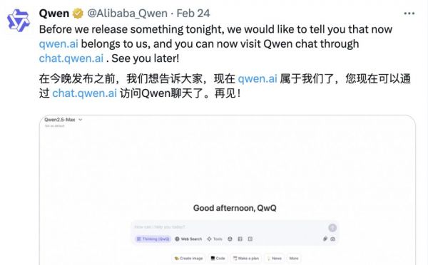 值得注意的是,昨天晚上,Qwen 的官方推特就预告了 QwQ 预览版的发布,以及一个 qwen.ai 的新域名。