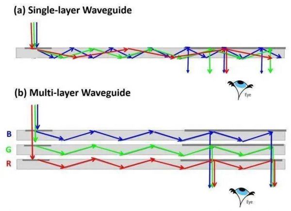 虽说可以针对RGB色彩,给镜片上设置不同的衍射光栅,来改善最终在出瞳位置的颜色均匀性,减小彩虹效应,然而这只能起到缓解作用,并不能完全消除。
