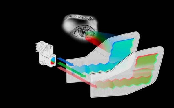 光源将光线发出后,经过特殊结构的镜片后,会通过一系列的反射/衍射过程,最后投入我们的眼睛,因此戴上AR眼镜,才能在眼前看见漂浮的文字,却不见显示光源在哪里。