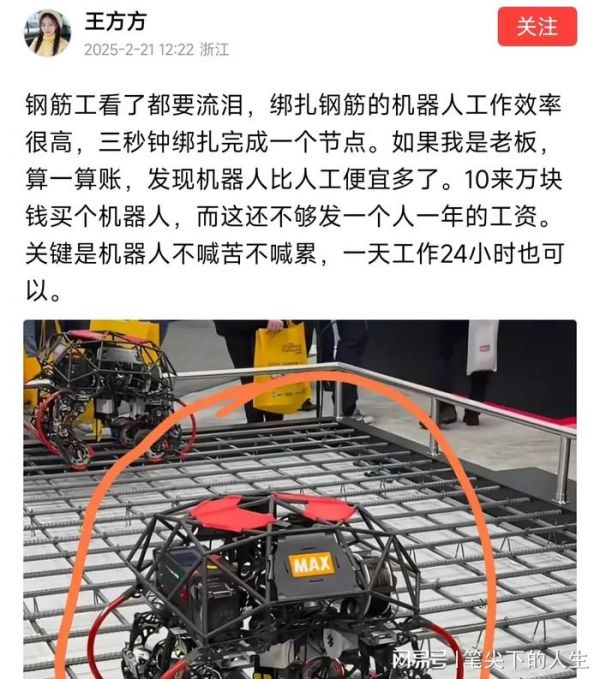 网传绑扎钢筋的机器人十来万一台,比人工省钱多了,也省心