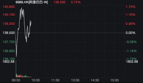 今日早盘,阿里巴巴股价大幅波动。小幅高开后,盘中走低,在该消息宣布后,一度涨超1.7%,截至目前,股价涨0.72%。