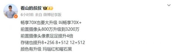 根据博主爆料的信息,华为畅享70X+的升级幅度颇为可观,比如在影像方面,前置摄像头从华为畅享70X的800万像素大幅提升至3200万像素。