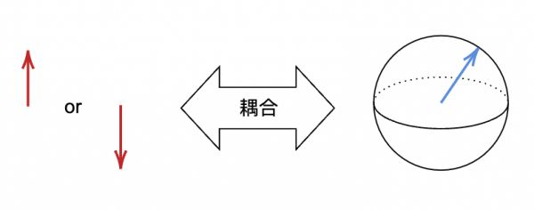 1976年,斯蒂芬·温伯格(Stephen Weinberg)开始关注这一现象,他提出了一个由标量场组成的量子场论,成功地实现了反常对称破缺(Inverse Symmetry Breaking)[4]。我们可以把这个温伯格构造的模型理解为两个耦合的自旋,其中一个只能取自旋向上或者自旋向下的态。另外一个子系统的自旋则可以在一个高维球面上取值。如下图所示,红色自旋处在有序态,而蓝色自旋处在无序态。它们之间的耦合,导致在提高温度时,红色自旋的有序态并不会被破坏。升高温度所产生的额外的熵,被蓝色自旋吸收。这非常类似于Pomeranchuk effect,由于He-3有额外的自旋自由度(He-3是费米子),熵被自旋吸收,从而实现了反常相变。