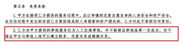 根据蒋先生提供的一份约定合同中,新浪财经发现,世纪佳缘设置了诸多免责条款。其中一条内容为:乙方向甲方提供的牵线服务仅为人工红娘牵线,并不能保证牵线结果一定成功,亦不保证甲方与牵线人选可以建立联系、恋爱关系或婚姻关系。这意味着,红娘前期口头的种种承诺,在付费并变成合同的时刻都成为“空谈”。