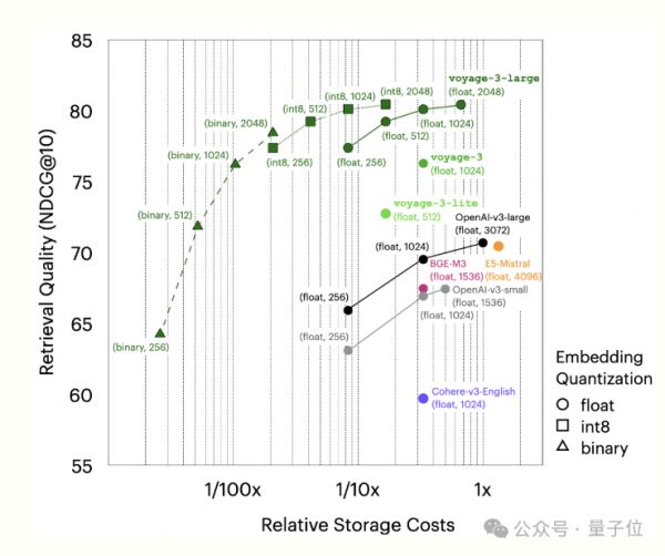 通用和多语言嵌入模型voyage-3-large:该模型在涵盖 100 个数据集的八个评估领域中排名第一,包括法律、金融和代码,上下文长度为32K。通过俄罗斯套娃表征学习(MRL)和量化感知训练,支持更小的尺寸和 int8 和二进制量化,可显着降低 vectorDB 成本,同时对检索质量的影响最小。