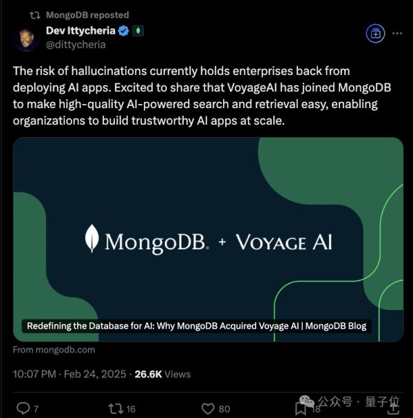 AI有潜力改变每个行业,但其应用因“幻觉”可能带来的风险而受到限制。通过将先进的AI驱动搜索和检索能力整合至我们高度灵活的数据库系统中,MongoDB和Voyage AI将帮助企业轻松构建能够创造重大业务影响的可靠AI应用。通过此次收购,MongoDB重新定义了AI时代的数据库。
