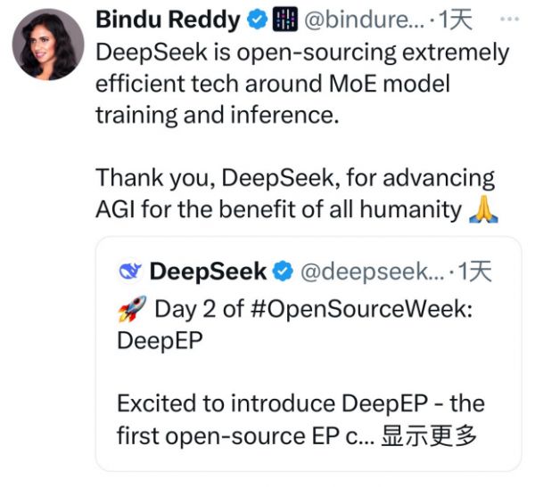 Bindu Reddy在X上表达振奋的心情:“DeepSeek正在围绕MoE模型训练和推理开源极高效的技术。感谢DeepSeek,推动AGI的发展,造福全人类。”Reddy曾在谷歌担任产品经理、在AWS担任人工智能垂直领域总经理并,后创办Abacus AI,是开源路线的信仰者。