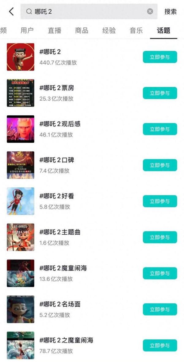 在抖音,《哪吒2》的爆火不仅体现在这一种视频上。实际上,由于中国观众对《哪吒2》超乎想象的热情,《哪吒2》的全球票房已经超过 138 亿元,攀升至影史票房榜第 8 名。体现在抖音,则是话题#哪吒2的播放量就已经超过 400 亿次,相当于每个抖音用户平均看了 40 条相关视频。