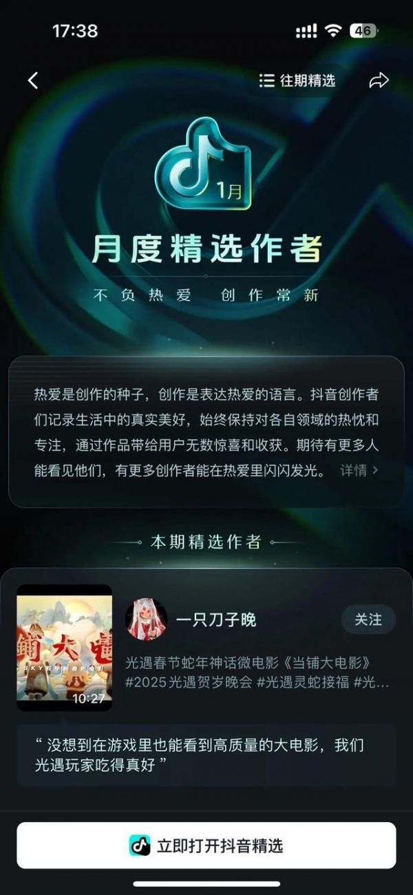 可以预见的是,在未来,以抖音精选作为代表的视频生态,将会挖掘出更多“精选”优质创作者,为渴望看到深度内容的观众带来更加精彩丰富的内容体验。