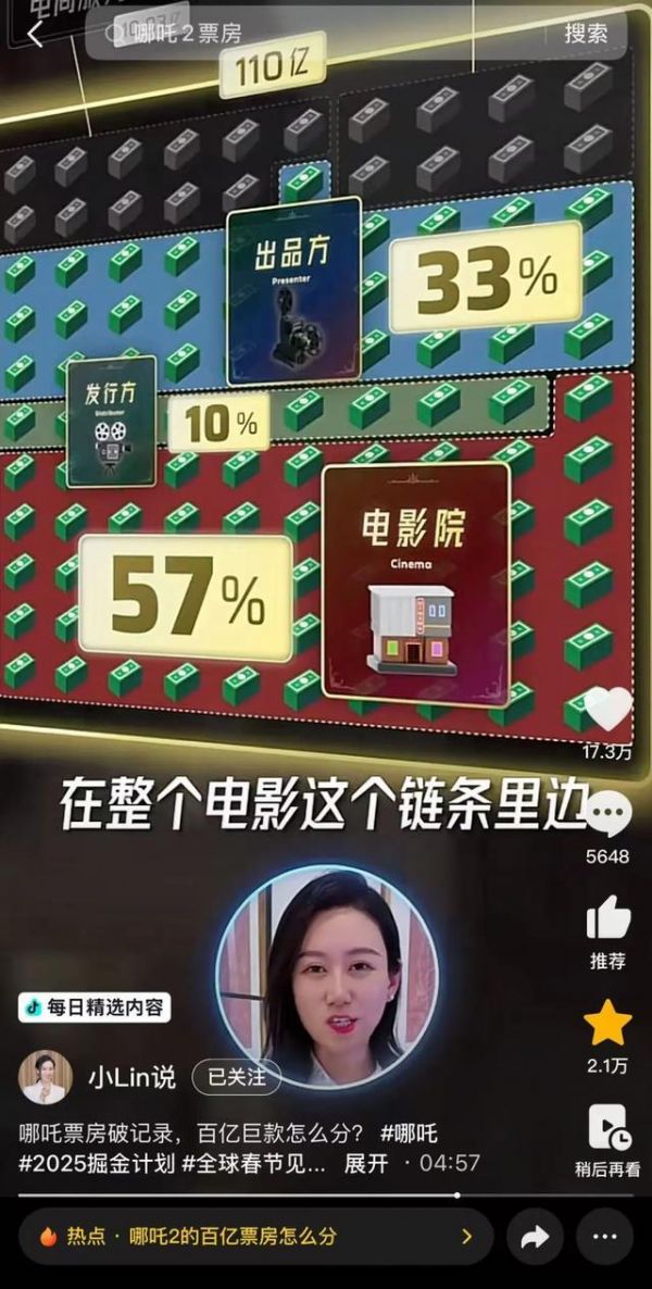 譬如,抖音精选作者“小lin说”给《哪吒2》百亿票房算的账就入选了每日精选内容。该视频给观众科普了电影的百亿票房最后会分别流入到哪些机构当中,以及导演饺子和其公司最终能收到多少钱。通过通俗易懂的比喻和简单明了的画面以及有理有据的分析,小lin最终给出了饺子及其公司大致能分得 15%的电影票房的结论。