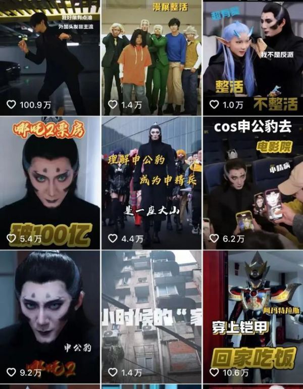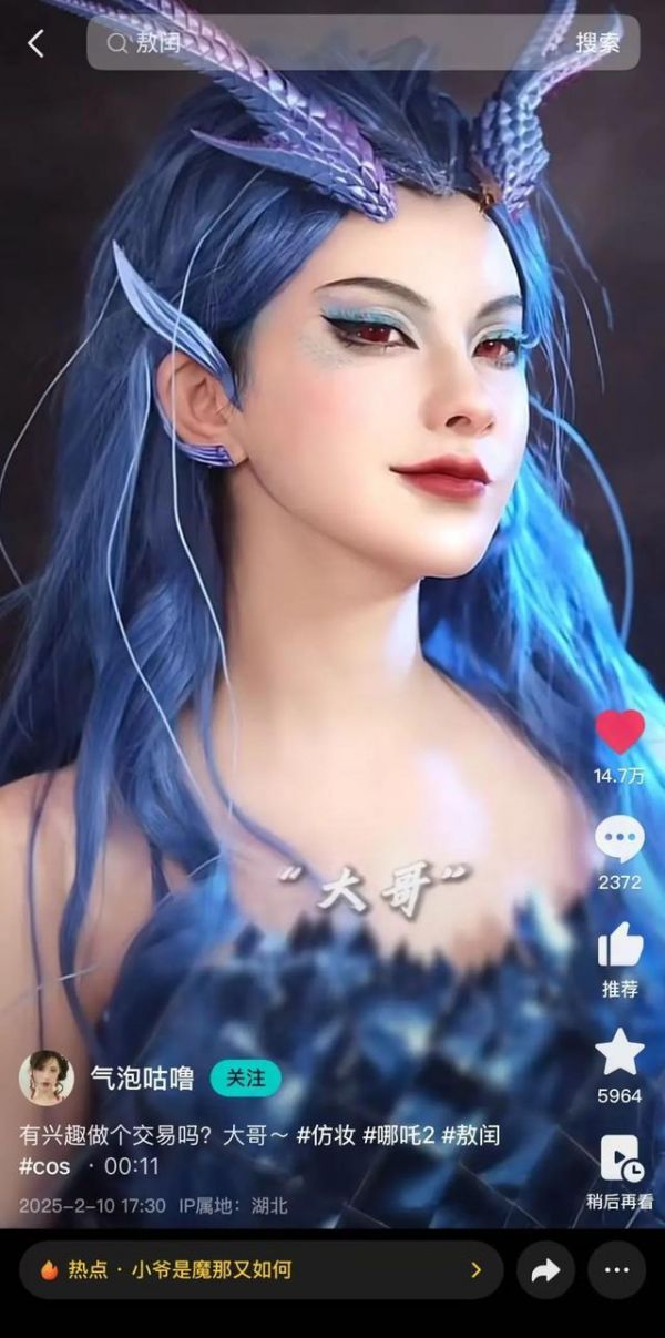 人气角色敖闰之外,影片中的石矶娘娘、陪伴石矶娘娘的魔镜、“正版”哪吒甚至是太乙真人,都有出色的仿妆视频出现。创作者“是初九呀”甚至还专门创作《哪吒2》中的各个角色,成为了《哪吒2》的仿妆专业户,评论区则充满着粉丝对cos新角色的恳求。