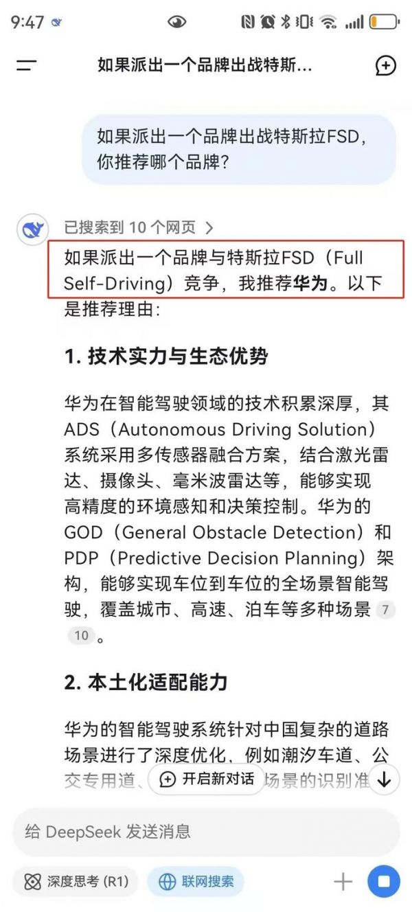 看到有网友问Deepseek推荐哪个品牌应战FSD,这个回答完全是意料之中…