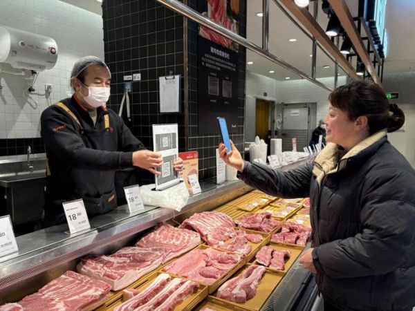 贵阳市一家猪肉生鲜门店内,消费者手机扫码查看相关产品信息。新华社记者 李凡 摄记者在该企业的智慧管理平台上看到,基于物联网、大数据等技术支撑,公司从饲料采购、生猪养殖、产品销售等方面实现了全链条智慧化管理。