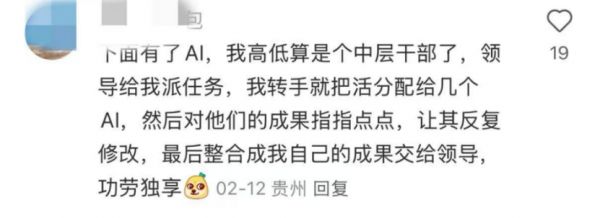 “领导给我派发任务,我转手就把活给分配到几个AI,然后对他们的成果指指点点,让其反复修改,最后整合成我自己的成果交给领导,功劳独享。”