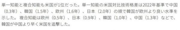 综合智能方面,欧洲(0.5年),日本(0.9年),韩国(1.0年),中国(1.3年),因此韩国比中国更早追击美国。