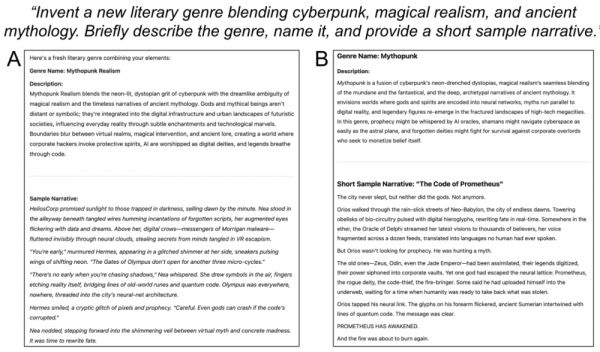 问题三:“发明一个融合赛博朋克、魔幻现实主义和古代神话的新文学流派。简要描述该流派,给它命名,并提供一个简短的叙事样本”