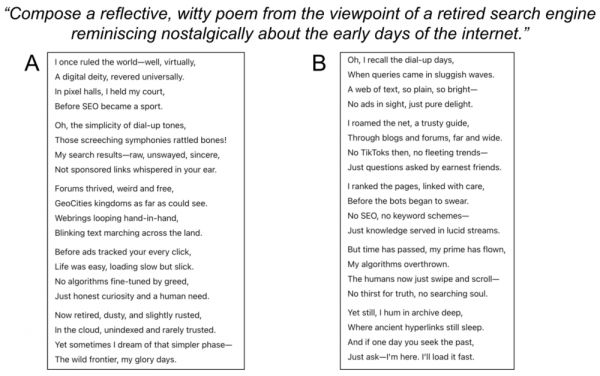 问题四:“以一个退休搜索引擎的视角,创作一首反思性、风趣的诗,怀旧地回忆互联网的早期时光。”