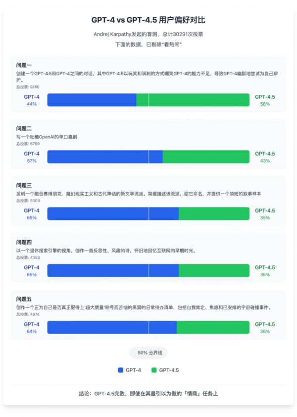 最后,Karpathy 揭晓:在这五个问题里,GPT 4.5 分别扮演着 ABAAB。换句话说:GPT 4.5,在情商任务上,完败。