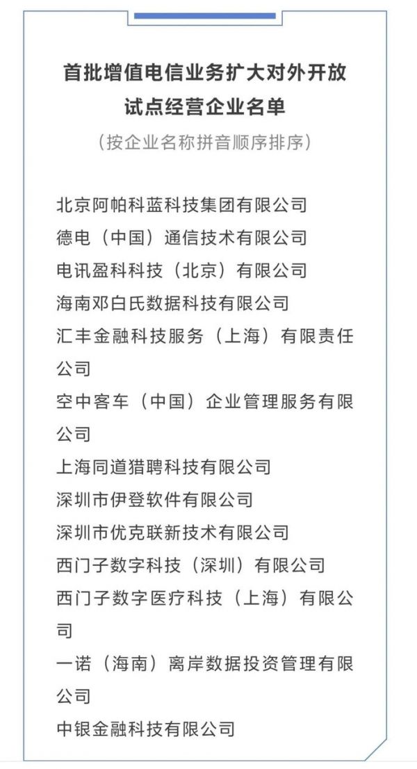 工信部近日向北京、上海、海南、深圳四地13家外资企业发放增值电信业务经营试点批复,相关企业按照批复内容,可开展互联网接入、信息服务等增值电信业务。