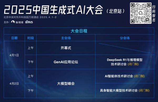 智东西参与主办的2025中国生成式AI大会(北京站)将于4月1-2日正式举办。50+位嘉宾将围绕GenAI应用、大模型、DeepSeek R1与推理模型、AI智能体和具身智能大模型等重要议题进行同台分享和讨论。欢迎报名~