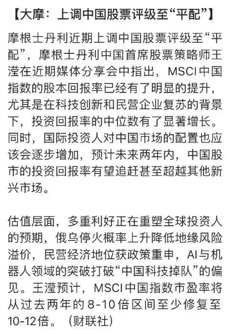 整体上,看好中国未来,大摩这次也罕见调高了中国评级;王滢认为,MSCI中国指数的市盈率将从过去的8—10倍提升至10—12倍,未来甚至有望进一步修复。尽管此次仅将中国股票评级从“低配”上调至“平配”,但她强调,全球投资人对中国市场的配置仍处于较低水平,尤其是科技板块。随着市场信心的回升,未来将有更多资金流入中国市场。