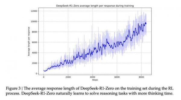 DeepSeek-R1 技术报告中展示随训练步数增长(横轴),输出长度(纵轴)持续增长。