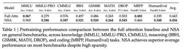 除了 MMLU(是涉及几十个学科的通用知识测试)和 MBPP(测试模型从自然语言合成简短 Python 的能力)两个指标,NSA 的表现都好于 Full Attention。