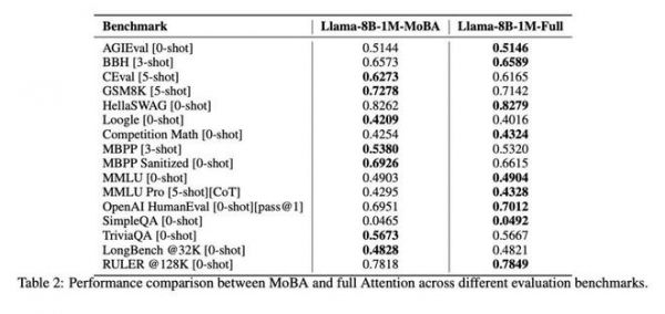 MoBA 与 Full Attention 的效果对比。MoBA 与 NSA 的基准选择有重合,也有区别。比如二者都测了衡量推理能力的 BBH、GSM8K,和与编程任务有关的的 MBPP,也都测了综合衡量长文本能力的 LongBench。