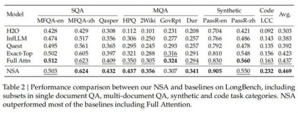 这张表中,NSA 则对比了 H2O、InfLLM 等过往稀疏注意力改进和 Full Attention 在测试长文本能力的 LongBench 上的表现,并展示了 MQA(多文档问答)、Code(代码)等细分任务上的得分。