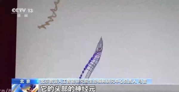 北京智源人工智能研究院生命模拟研究中心负责人 马雷:这是整个神经元的细节,你会看到线虫运动的时候,它的头部的神经元不停地往下放电,这里面的颜色亮的地方代表产生了比较强的神经信号,一个动作电位,然后往下传输,同时刺激肌肉不停地在往前走。